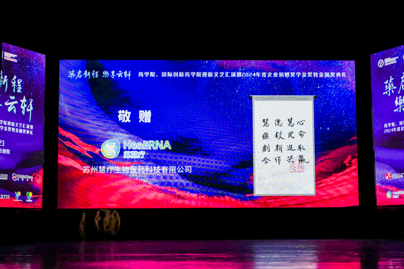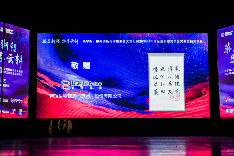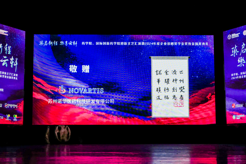 上半场演出结束后进行了2024年度企业捐赠奖学金奖教金颁奖典礼。首先是致谢仪式,2022年以来,艾博生物、博瑞医药、慧疗生物、玉森新药、苏州诺华、旭光科星在药学院设立奖学金、奖教金和捐赠“耕药”助学金,鼓励在校学生勤奋学习、刻苦钻研、全面发展,褒奖教职员工在教学、科研和管理岗位上敬业奉献,对促进药学人才的培养及推动药学教育持续高质量发展具有重要意义。