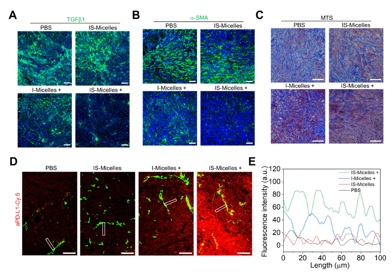 图3 IS-Micelles对胰腺癌组织纤维化水平的影响。(A)PANC02肿瘤TGFβ1荧光染色图;(B)PANC02肿瘤α-SMA荧光染色图;(C)PANC02肿瘤Masson染色图;(D、E)aPD-L1抗体肿瘤浸润荧光图片及荧光强度统计。