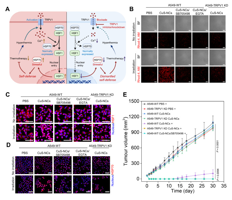 图1 TRPV1离子通道阻断对肿瘤光热治疗的增敏机制及抗肿瘤作用。(A)TRPV1离子通道阻断策略增敏热疗示意图;(B)A549-WT和A549-TRPV1 KD细胞的钙离子荧光染色图;(C)A549-WT和A549-TRPV1 KD细胞的HSF1荧光染色图;(D)A549-WT和A549-TRPV1 KD细胞的HSP70荧光染色图;(E)CuS-NCs在A549-WT和A549-TRPV1 KD皮下荷瘤小鼠模型中的肿瘤生长抑制曲线。