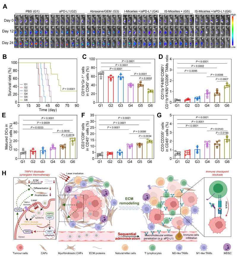 同时,还发现IS-Micelles具有明显的肿瘤细胞外基质调控功能。其介导的光热治疗及TRPV1离子通道阻断功能显著抑制胰腺癌组织中TGFβ1的表达(图3A),使肿瘤部位的成纤维细胞比例下调(图3B),肿瘤细胞外基质的纤维化水平降低(图3C),从而有助于aPD-L1抗体在PANC02胰腺癌中的瘤内浸润(图3D、E)。上述结果表明,IS-Micelles有望与免疫检查点阻断疗法产生协同治疗作用。