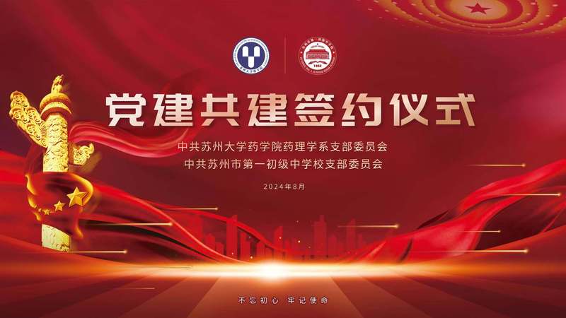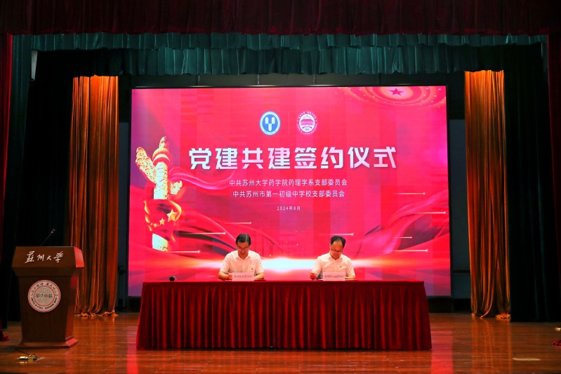8月25日上午,我院药理学系党支部与苏州市第一初级中学校党支部在本部敬贤堂进行了党建共建签约仪式。我院党委书记、国际创新药学院党委书记王欣、学院办公室主任、药理学系党支部副书记金雪明,苏州市第一初级中学书记校长包黎青、副书记黄沁之、副校长陆丽红等领导与360多名新生及家长代表出席并见证了此次活动。