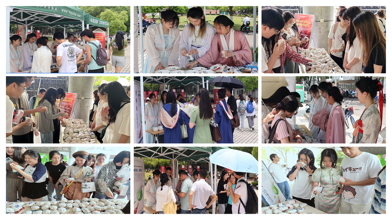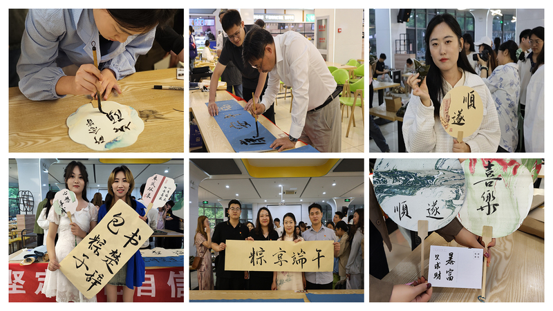 粽享端午:书楚辞,包粽子。6月5日下午,“书楚辞,包粽子,迎端午”活动在学生第七食堂顺利开展。王欣老师莅临活动现场,亲笔书写“端午安康”,为师生们送上节日祝福。同学们在老师和工作人员的指导下,积极参与粽子的制作,场地充满了浓郁的节日氛围。热腾腾的粽子不仅仅是对端午节传统习俗的传承,更是对未来美好生活的期盼和祝福。与此同时,还进行了书楚辞、制团扇活动。本科生生物科学类党支部徐灿同学,用毛笔在准备好的团面上、书签上、明信片上书写楚辞或者端午节日祝福,她专注的神情和流畅的笔法吸引了不少师生驻足欣赏。大家纷纷起笔,写下心愿和祝福,祝愿端午安康、国泰民安。