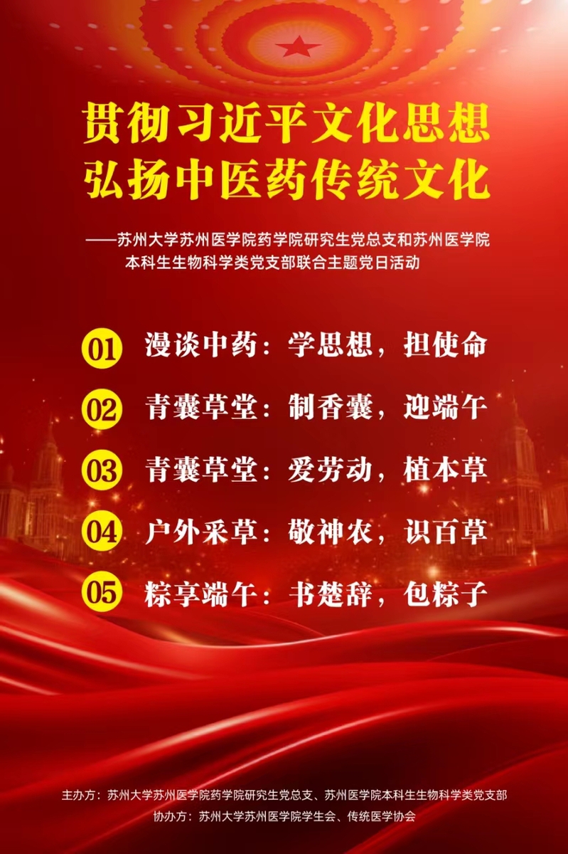 为进一步弘扬中医药文化,让更多青年学子体会中医药文化的魅力,引导新时代大学生坚定文化自信、担当使命、奋发有为,药学院研究生党总支和苏州医学院本科生生物科学类党支部联合举办了“贯彻习近平文化思想,弘扬中医药传统文化”的主题党日活动。活动包括“学思想,担使命”“制香囊,迎端午”“敬神农,识百草”“爱劳动,植本草”和“书楚辞,包粽子”等五个子活动。