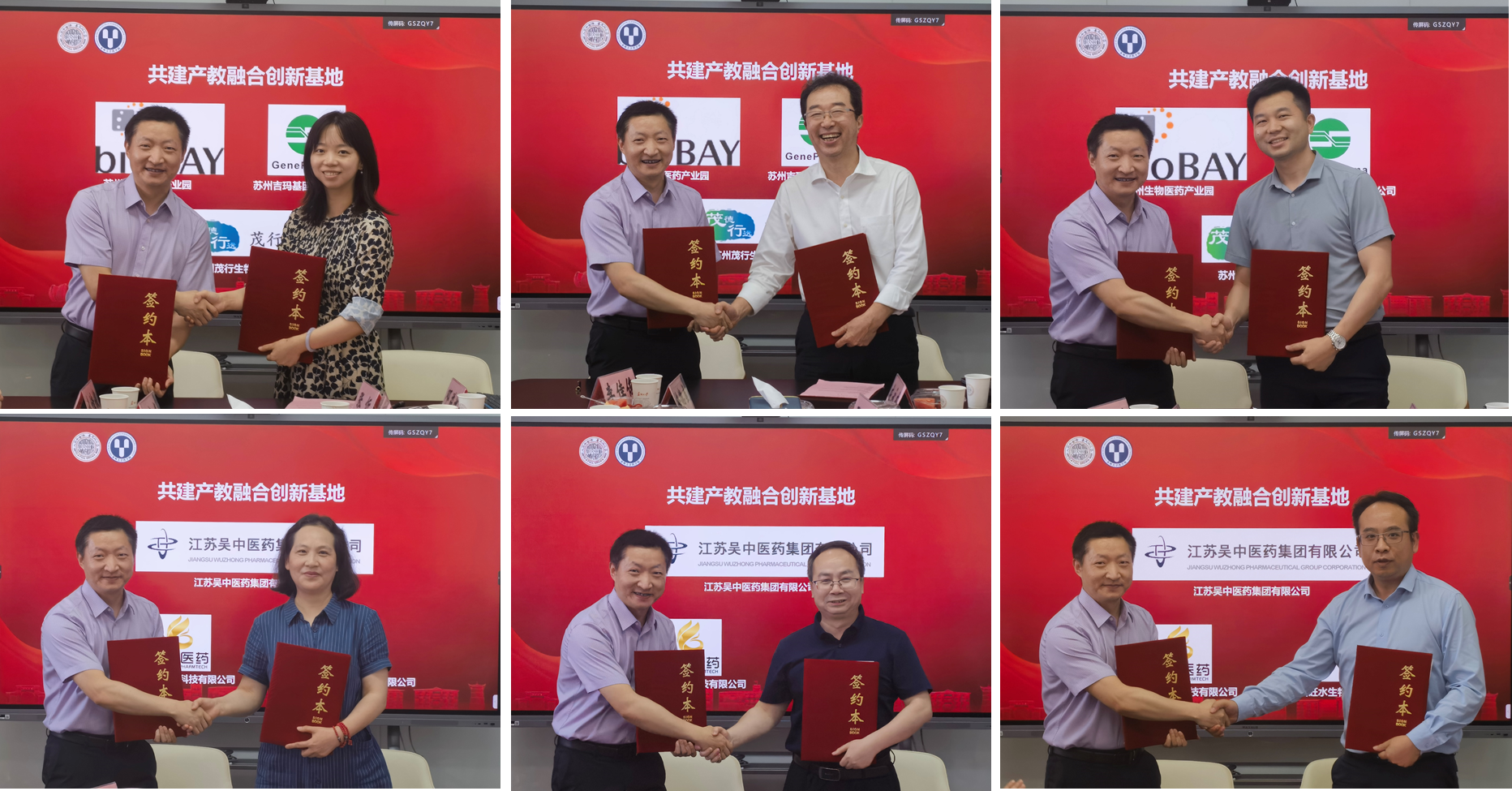 会议举办了签约仪式,药学院与苏州生物医药产业园、苏州吉玛基因股份有限公司、江苏吴中医药集团有限公司、苏州茂行生物科技有限公司、苏州旺山旺水生物医药股份有限公司、苏州国匡医药科技有限公司等签订了共建产教融合创新基地的合作协议。