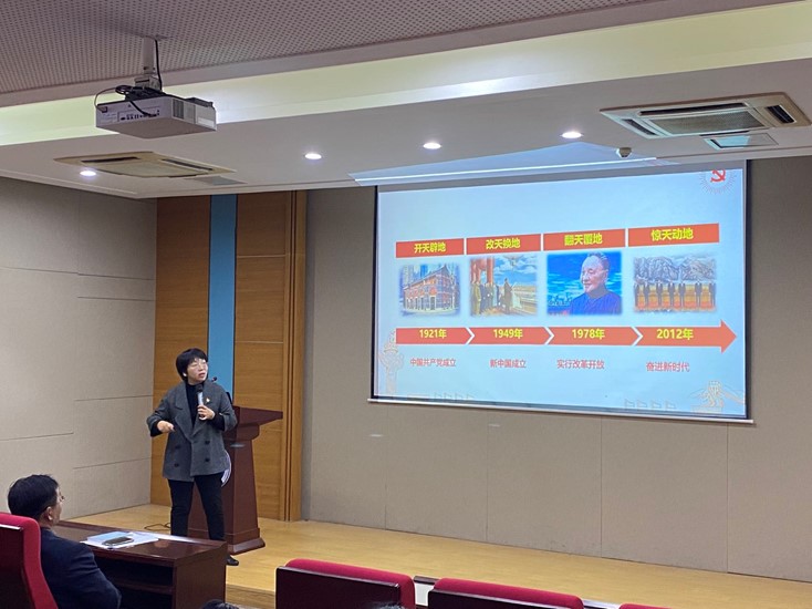 宣讲会由苏州大学学习宣传贯彻党的十九届六中全会精神宣讲团成员、马克思主义学院副院长朱蓉蓉教授主讲。朱蓉蓉教授以“百年奋斗 再启新程”为主题,从十九届六中全会召开的时代背景、重大意义,《中共中央关于党的百年奋斗重大成就和历史经验的决议》的主要内容、核心要义与显著特点,以及党百年奋斗历程中蕴含的智慧和力量等三个方面,对十九届六中全会精神进行了深入解读。会议由院党委书记王欣主持。