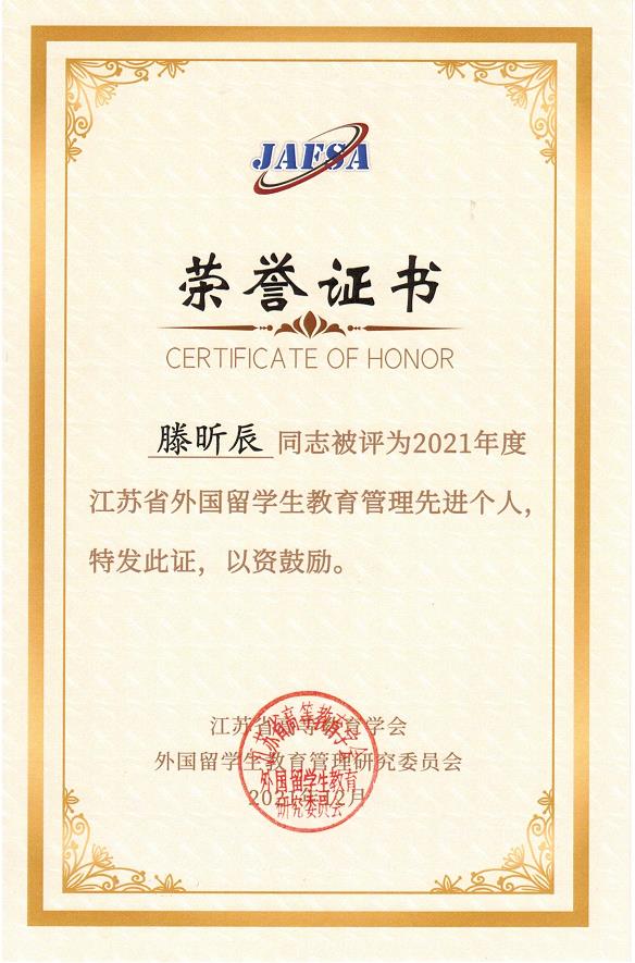 近日获悉,我院滕昕辰老师因在留学生管理工作中表现优秀,获得“2021年度江苏省外国留学生教育管理先进个人”称号。