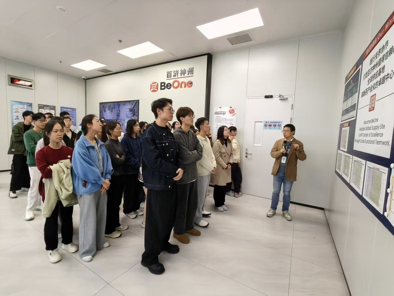 在企业团队的专业引导下,师生一行深入参观了百济神州苏州基地的企业展厅、核心研发区域、QC实验室及小分子创新药物生产的相关设施,近距离了解分析实验室、微生物实验室的先进设备与数字化运营模式,直观感受了从药物发现到临床转化再到商业化生产的全链条运作流程。同时,师生还参观了企业的配套生活设施,如健身房、餐厅等,切实感受了企业对员工生活的关怀与重视,对公司“百创新药,济世惠民”的发展理念有了更深的体会。