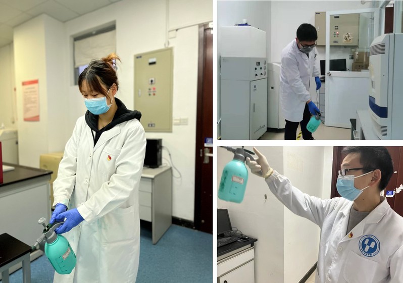 党有号召,团有行动。以李禛芸,秦望智,颜鹏举三位同学为代表的党员、团员,第一批申请参加学院仪器共享平台的防疫消杀工作,佩戴党章彰显党员身份,志愿维护平台环境践行党员使命,保障实验环境安全是他们的共同心声。