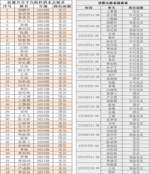 因疫情防控需要,学院实验平台仪器防疫消杀工作和部分宿舍隔离同学的就餐问题亟需解决。我院广大研究生党员、团员迅速响应学院党委号召报名成立志愿者队伍,服从统筹安排,积极参加志愿服务工作,充分发挥党员先行的模范带头作用,为我院抗疫防疫工作贡献一份力量。