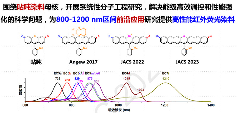 红外荧光染料在生物医学有重大潜力,是精细染料化工重点技术突破方向。围绕呫吨染料的能级精准调控和性能高效强化等关键科学问题:(一)提出线性染料平面化的策略,通过呫吨染料的母核横向共轭,创制EC系列红外染料母核,解决多甲川类染料易发生“佩尔斯相变”的研究瓶颈,实现红外波段能级在800-1400 nm的精细调控;(二)提出平面染料立体化的策略,通过在EC染料母核中位垂直平面增加桥连螺共轭基团和阻转位阻基团,抑制振动介导内转换,屏蔽活性物质反应路经,解决发光效率低、稳定性差、易聚集的研究瓶颈,实现红外染料性能突破;(三)通过耦合组织定位、荧光传感和药物控释等机制,实现立体染料功能化,用于活体多色影像、高灵敏分子传感和重大疾病治疗。