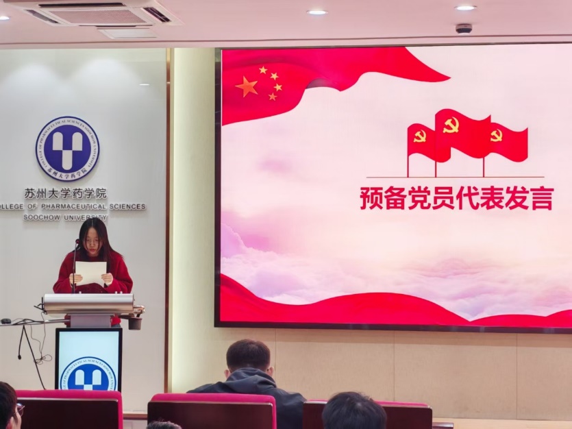 预备党员代表罗洁同志在发言中回顾了入党历程,并分享学习党的二十届四中全会精神的心得。她表示,作为药学专业研究生,将把誓言转化为行动,在科研中攻坚克难,在服务中传递温暖,以实际行动践行“健康为民”的初心。