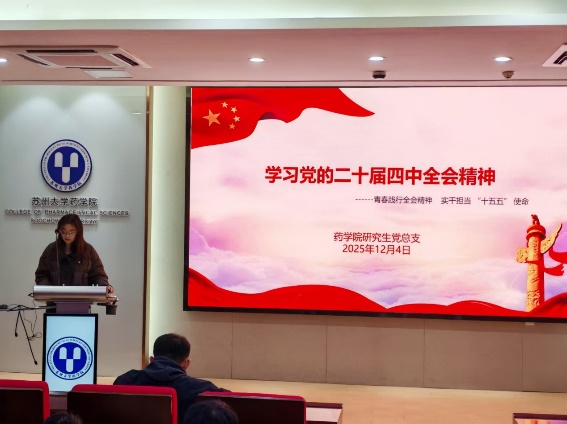 为深入学习贯彻党的二十届四中全会精神,筑牢新党员理想信念根基,12月4日,药学院研究生党总支组织“青春践行全会精神 实干担当‘十五五’使命”专题学习暨新党员入党宣誓仪式。新发展预备党员、各研究生党支部书记及入党积极分子参加会议。
