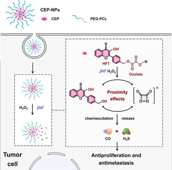 在前期工作中,季兴跃教授与陈华兵教授/柯亨特教授合作,提出了“化学能激活CO前药策略”,利用H2O2与草酸酯反应产生的化学能激活光敏CO前药,有效克服了光照带来的固有缺陷,并实现CO靶向肿瘤的可控激活(Angew. Chem. Int. Ed. 2022, 61, e202200974;Science China Chem. 2025, 68, 2565–2571.)。然而,该策略仍存在急需解决的问题:1)高能中间体“1, 2-二噁烷-3, 4-二酮”半衰期极短(~ ms),为确保CO的释放效率,草酸酯需过量使用(约为CO前药的十倍),可能引发毒副作用,且CO释放效率仅约50%。2)草酸酯聚合物的聚合度受合成条件影响,导致批次间差异较大,难以质量控制。为彻底解决上述问题,课题组提出“基于邻近效应的化学能激活前药”策略,通过将草酸酯片段直接与光敏CO前药(硫代3-羟基黄酮)偶联,构建单分子前药,在邻近效应的促进下,使化学能高效转移激活CO前药。令人惊喜的是,此体系还伴随着H2S的生成(图1)。