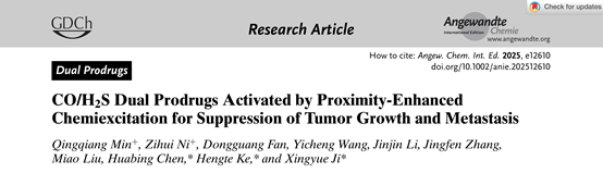 论文信息:Qingqiang Min+, Zihui Ni+, Dongguang Fan, Yicheng Wang, Jinjin Li, Jingfen Zhang, Miao Liu, Huabing Chen*, Hengte Ke*, Xingyue Ji*, CO/H2S Dual Prodrugs Activated by Proximity-Enhanced Chemiexcitation for Suppression of Tumor Growth and Metastasis. Angew. Chem. Int. Ed. 2025, e12610.