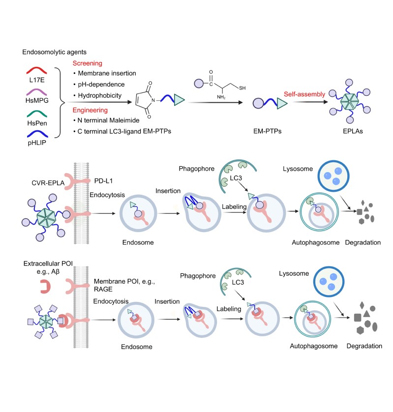 针对这些挑战,苏州大学韩亮教授团队创新性地设计了一种名为EPLA(内体-自噬体锚定复合物)的通用型降解工具。该技术巧妙融合了内体与自噬途径,通过将自噬体靶向标记锚定至内体膜,实现目标蛋白内化后可诱导内体与自噬体空间接近,进而通过自噬-溶酶体途径完成高效降解。EPLA在实验中展现出显著的模块化与通用性,已成功降解多种细胞膜蛋白(如PD-L1、RAGE、GRP94)及细胞外病理蛋白(如淀粉样蛋白-β和tau蛋白)。在小鼠乳腺癌模型中,通过有效降解PD-L1,显著抑制了肿瘤生长,验证了其在治疗应用中的潜力。