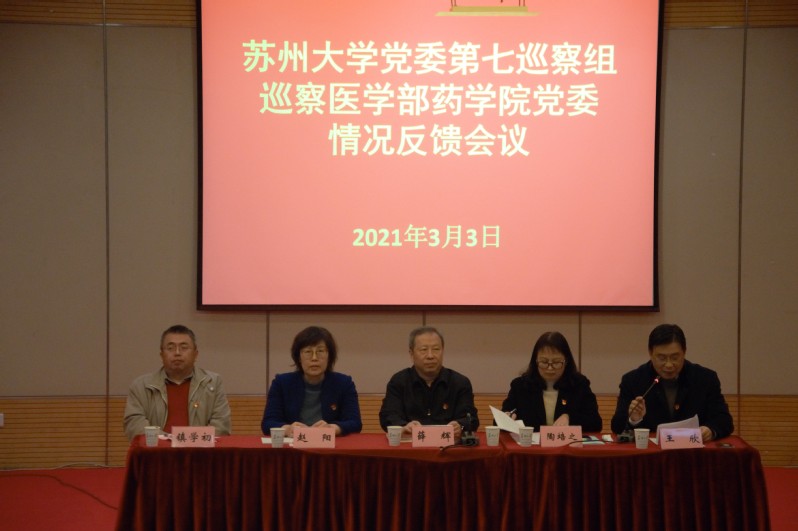 3月3日下午,校党委第五轮巡察第七巡察组巡察药学院党委情况反馈会议在炳麟图书馆学术报告厅召开。校党委常委、校党委办公室主任、第七巡察组组长薛辉,巡察组副组长赵阳及巡察小组其他全体成员参加会议;反馈会由药学院党委王欣书记主持,学院全体教职员工参加。
