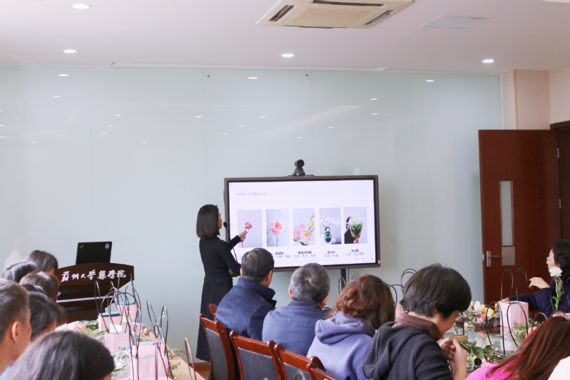 本次活动邀请达派花艺的阿敏老师,向教工传授插花技巧。通过ppt的展示,使大家认识了许多不同类型的花,便于大家后续的搭配。授课老师告诉大家,要选取一朵最美丽的花作为主花,突出中心,两侧各插一支不同花卉陪衬,要避免花枝排列整齐,主体花要突出。接着,老师分别从修剪、固定、插序、点缀等方面,为大家详细讲解了插花活动各个流程,强调了插花搭配要注重高低错落、疏密有致、仰俯呼应等原则。