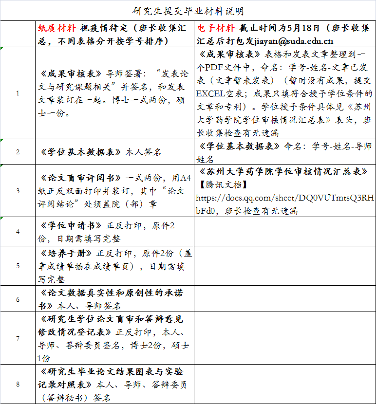 5、填写《苏州大学药学院学位审核情况汇总表》电子版,链接:https://docs.qq.com/sheet/DQ0VUTmtsQ3RHbFd0,请按照示例认真填报,不能留空。
