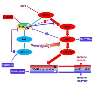 全世界范围内,肺癌的发病率、死亡率都极高并呈上升趋势。2018年全球统计数据显示,男性肺癌发病率及死亡率均占恶性肿瘤第1位,女性肺癌发病率位列恶性肿瘤第3位,死亡率位列第2。目前,靶向抑制PD-1/PD-L1的免疫疗法对约30%的病人显示良好的疗效,但是仍然对一大部分病人没有疗效。只有深入研究肺癌的免疫逃逸机制,才能为临床肺癌提供有效的免疫治疗策略。该论文通过TCGA大数据分析发现IGF1R高表达肿瘤中CD8+ T细胞被抑制,同时IGF1R和B7-H4基因呈正相关。随后通过临床样本的免疫组化及细胞水平实验,验证IGF1R激活后可通过MEK/ERK信号通路上调B7-H4表达。IGF1R高表达的肿瘤细胞可抑制CD8+ T细胞的功能,并且B7-H4介导了该抑制作用。由于B7-H4与PD-L1同属于负性共刺激分子家族成员,在肿瘤的免疫抑制中发挥作用,本论文的研究提示,在IGF1R高表达或高度激活的肺癌中,肿瘤细胞有可能是通过B7-H4的通路来实现免疫逃逸,因此B7-H4对此类型肺癌,将有可能是一个潜在的免疫治疗的靶点。