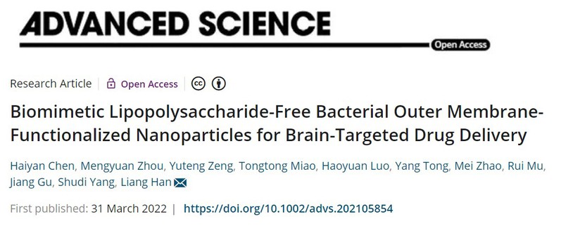 相关工作以“Biomimetic Lipopolysaccharide-Free Bacterial Outer Membrane-Functionalized Nanoparticles for Brain-Targeted Drug Delivery”为题,发表于Advanced Science 2022, 2105854. DOI: 10.1002/advs.202105854。苏州大学药学院韩亮教授是论文的通讯作者,2019级硕士研究生陈海燕是论文的第一作者。