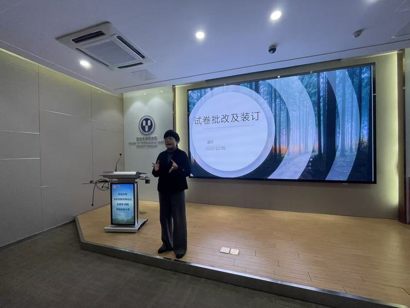 然后,教务秘书温红老师结合学校教务部《关于做好考试试卷及相关教学材料规范的通知》要求,通过 PPT 直观展示了监考工作的全流程规范与重点注意事项。在命题与试卷管理方面,温红老师详细解读了 A、B 卷命题要求、参考答案与评分标准制定、试卷装订顺序等核心内容,明确试卷需按考试命题审核表、成绩记载表、考试质量分析表及评分标准、样卷、学生试卷的顺序规范装订。在监考执行环节,她着重强调,监考教师必须提前 15 分钟到场,完成清理考场、调整学生座位、宣布考试纪律等准备工作;考试过程中要密切关注考场动态,对违纪行为需立即终止考生考试,保留证据并及时上报;考试结束后,需按规定完成试卷批阅、成绩录入等工作,成绩录入须在 2026 年 1 月 16 日中午 12:00 前完成,严格遵循成绩比例设置要求,杜绝错录、漏录、迟录等情况。此外,温红老师还通报了 2025 年学校发生的几起教学事故案例,通过实例警示全体教师严守教学规范,妥善应对突发状况。