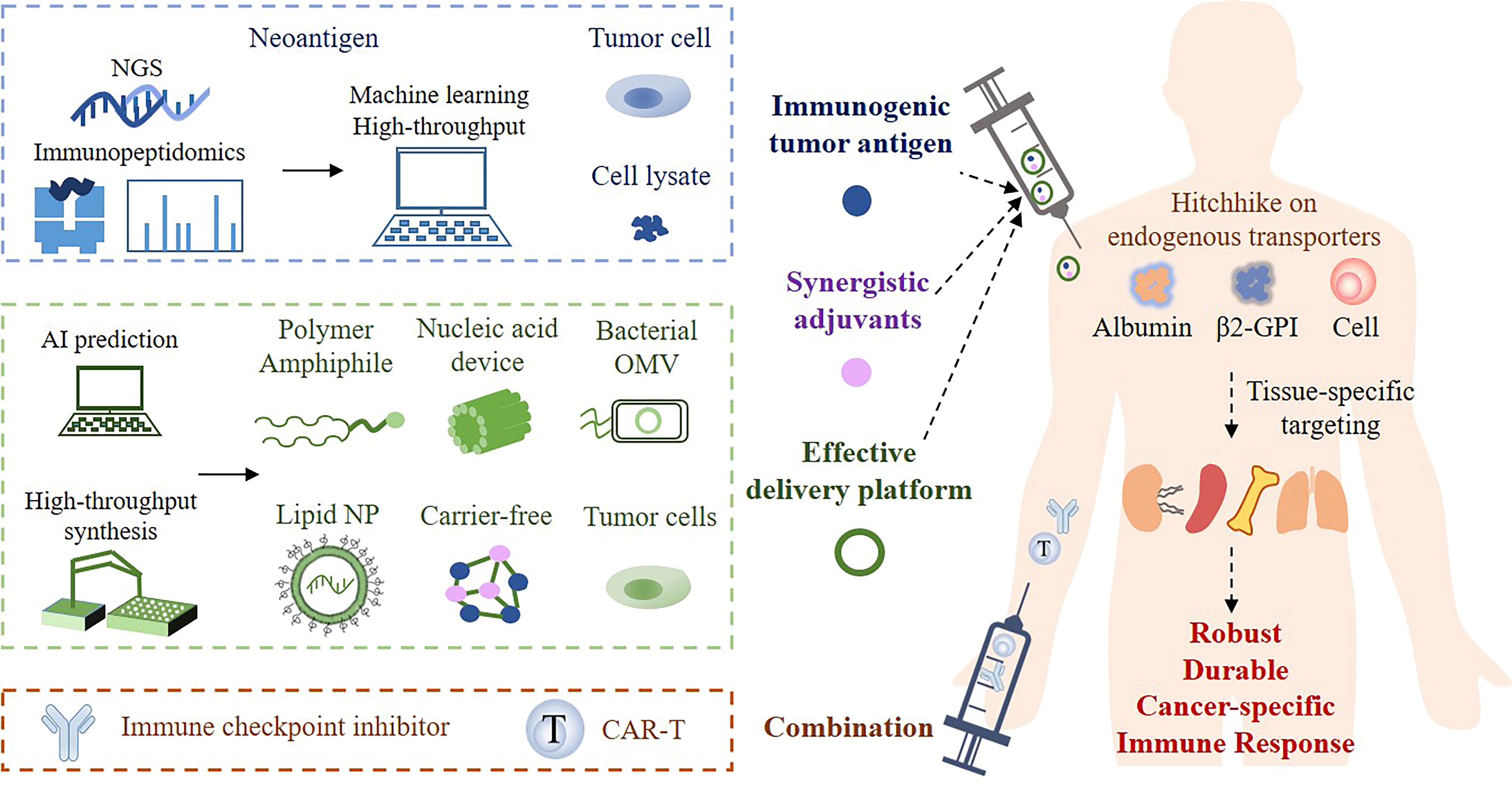 癌症疫苗在临床抗肿瘤试验中展现了巨大的潜力,其不仅可以高效治疗肿瘤,还可帮助病人清除手术或放化疗后的残余肿瘤细胞和预防肿瘤复发,可望实现癌症的彻底治愈。近年来,癌症疫苗相关的基础研究和工程技术迅猛发展,为开发新一代癌症疫苗奠定了基础。本文从抗原、免疫佐剂和递送系统等疫苗重要组分出发,总结了激发体内高效、持久和特异性抗癌免疫反应的前沿技术,提出了在增强疫苗疗效和降低毒副反应方面值得关注的研究方向,展望了创新研发癌症疫苗的未来蓝图。文中重点介绍了:1)自下而上的高通量方法,筛选肿瘤特异性新抗原和疫苗递送体系;2)自上而下的创新方法,设计高效疫苗递送体系,工程化构建其对器官和组织的靶向性;3)癌症疫苗与现有其它临床免疫疗法(如CAR-T疗法和免疫检查点抑制剂)的协同治疗方案。相关工作以“Roadmap to Next Generation Cancer Vaccines”为题,发表于Journal of Controlled Release 2022,347:308-313(DOI: 10.1016/j.jconrel.2022.05.005)。苏州大学药学院郑毅然教授和钟志远教授是论文的通讯作者。