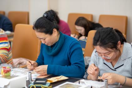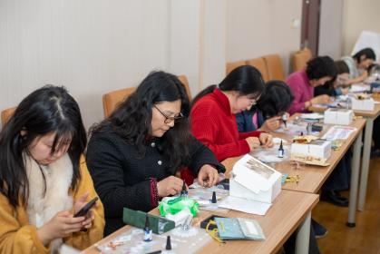 本次活动以非遗螺钿工艺为核心载体,让大家近距离感受传统手工艺的独特魅力。活动现场为参与女教职工准备了全套制作材料与工具,大家签到领取专属材料包后,满怀期待开启手作之旅。非遗专业老师还开设了螺钿文化小讲堂,以生动易懂的方式讲解螺钿工艺的历史渊源、美学价值与基本制作技法,从新石器时代雏形到宋元兴盛再到明清精湛,千年螺钿工艺的璀璨魅力让在场老师们心生赞叹。