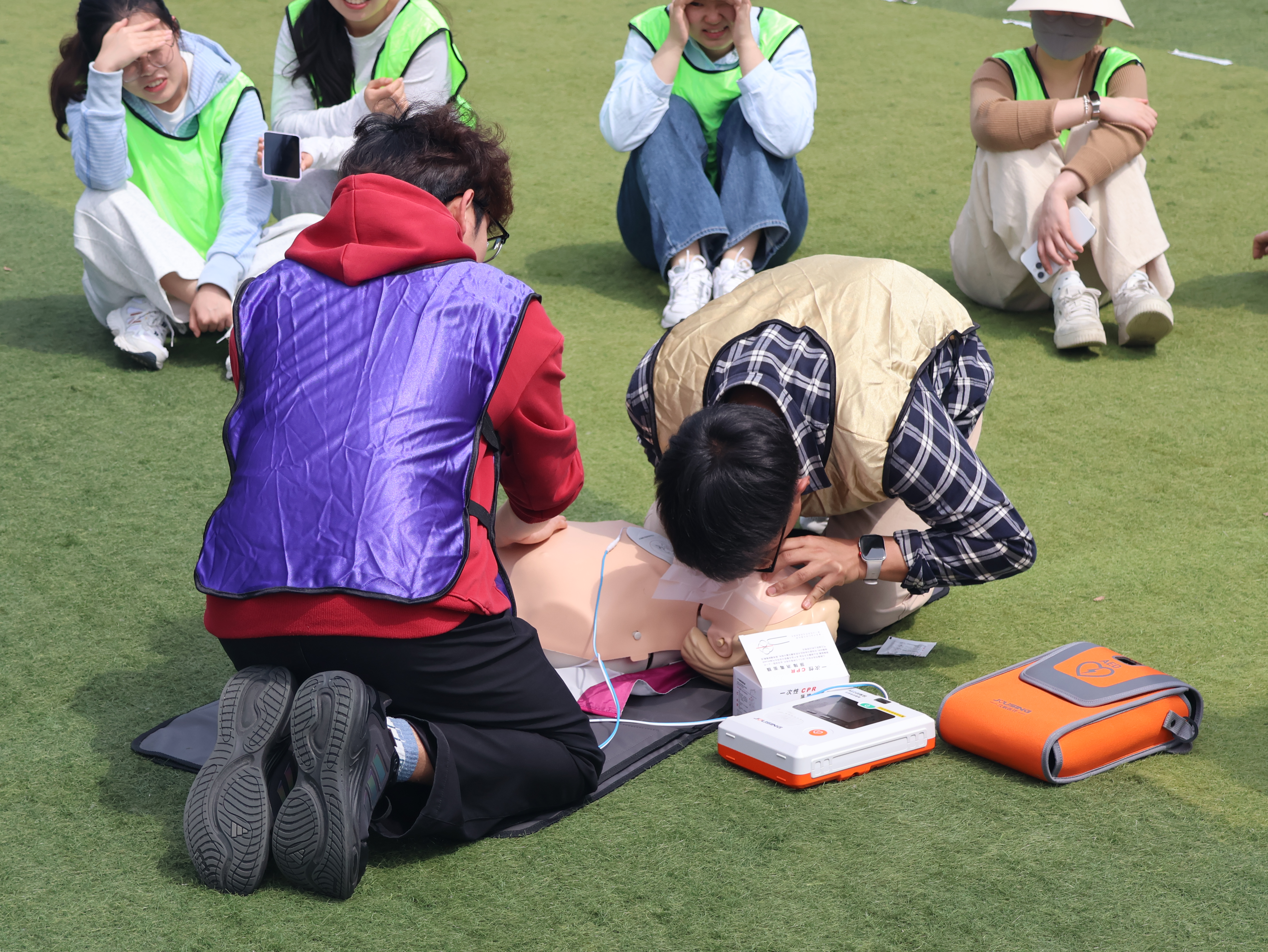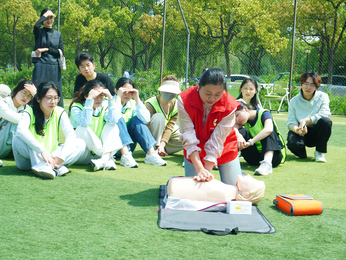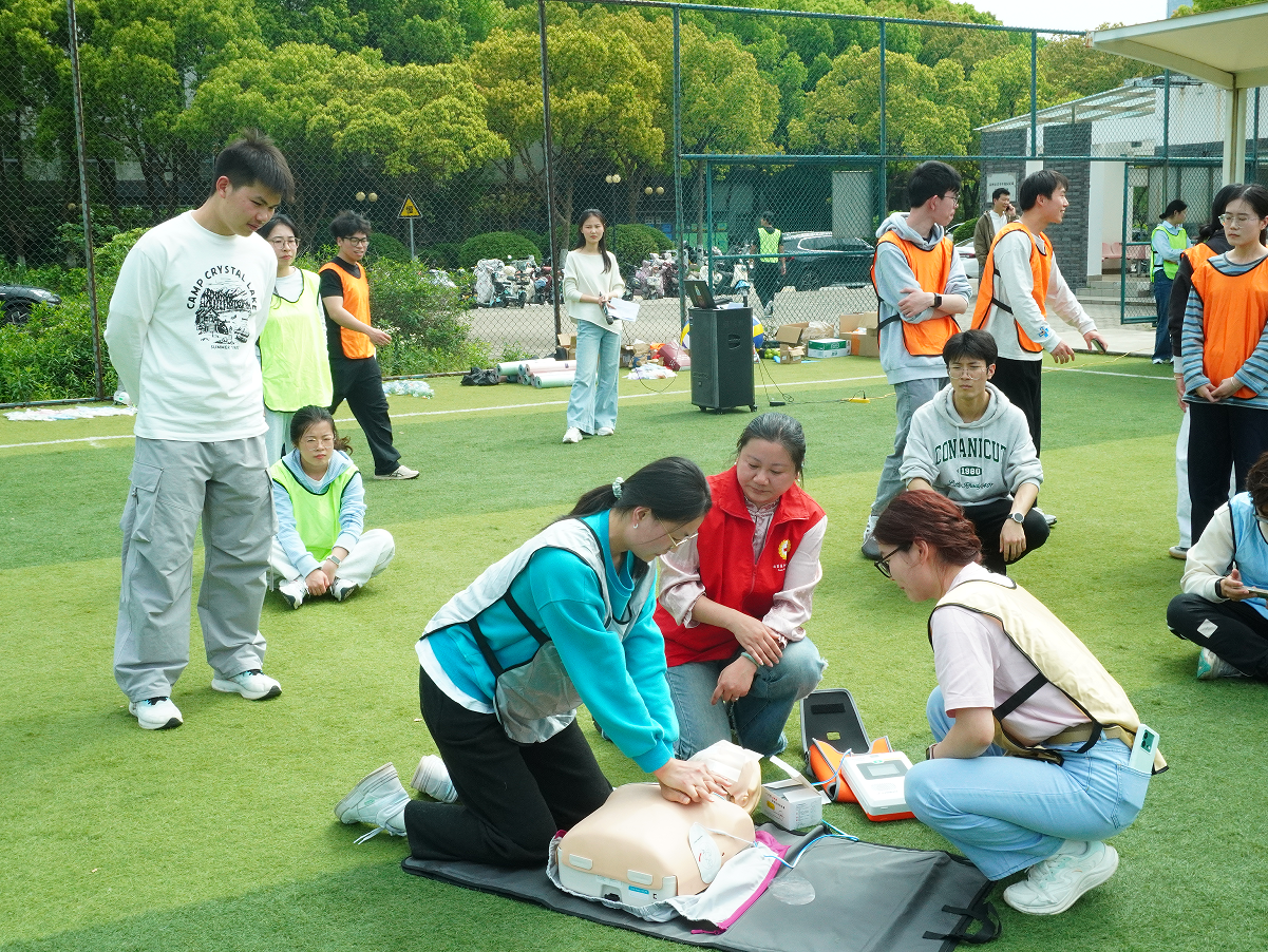运动会正式开赛前,一场干货满满的应急救护技能培训率先登场。来自姑苏区红十字会的管老师,现场讲授了心肺复苏(CPR)与自动体外除颤器(AED)的操作要点。同学们轮流在人体模型上动手实操,认真学习如何在关键时刻“敢救、会救、科学施救”。不少同学直呼:“这是运动会最‘值’的一课!”