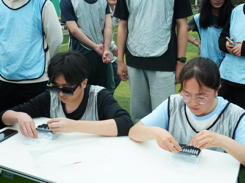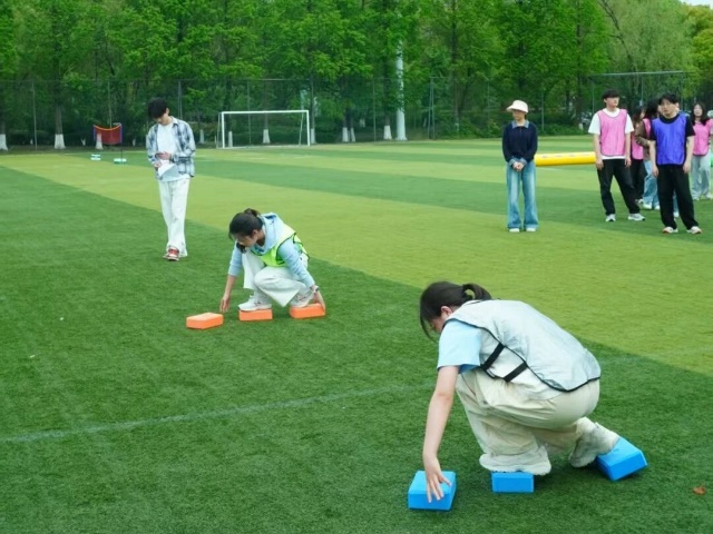 第一个竞赛项目“分秒必争”就燃爆全场。袋鼠跳跳跳中,同学们套上麻袋,一蹦一跳冲向终点,有人摔倒了爬起来继续,场面既搞笑又感人。紧接着的“摸石头过河”更是考验平衡与耐心,脚不能沾地,手忙脚乱中频频“落水”。最后的“‘枪’王争霸”则是药学院专属技能——插枪头!五个队员同时开干,枪头盒一个接一个被填满。那手速,那专注度,堪称“实验室速度与激情”。