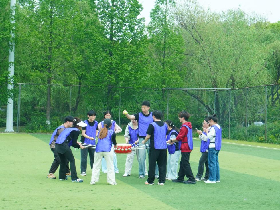 十二个人、二十四根绳、一面鼓、一个球——“同心击鼓”项目看似简单,实则对全队的步调一致与力道均匀提出了不小的考验。一人负责放球,众人拉绳颠球,且球必须弹起20厘米以上才算有效。比赛伊始,鼓面左摇右晃,球满场乱飞,引得大家哈哈大笑。但经过短暂磨合,各队逐渐找到了节奏,“咚咚咚”的鼓声愈发沉稳有力。三次挑战机会,究竟谁能创造更高的颠球纪录?最终,“无所谓队”一鸣惊人,连续颠球超过一百个,现场顿时爆发出阵阵欢呼与掌声。