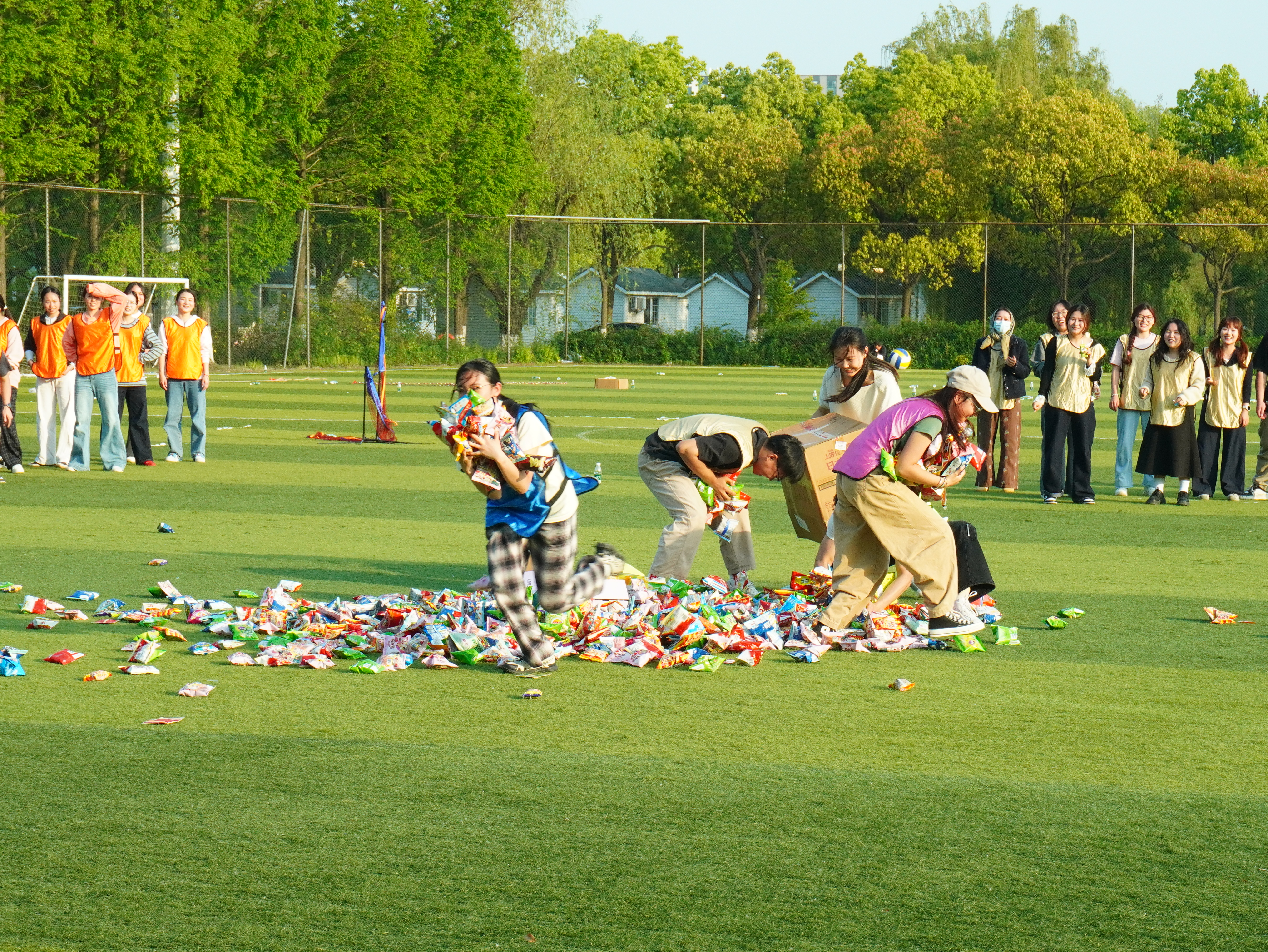 如果说前面的项目拼的是体力与默契,那这一关拼的只有两样——手速,以及“贪吃”的勇气!运动会压轴环节“零食大作战”刚一登场,全场瞬间沸腾。操场正中央,各式各样的零食堆成了一座小山,薯片、饼干、辣条……琳琅满目,光是看一眼就让人迈不动腿。各支队伍围着“零食山”摆开阵型,每轮派出一名“抢手”,听口令冲向目标——能拿多少拿多少,拿完火速跑回,换下一个人继续冲锋。规则简单粗暴,快乐没有上限!