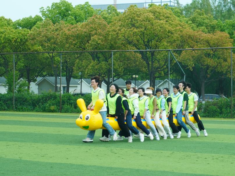 “一二、一二、一二……”伴随着整齐响亮的口号,十二名选手骑跨在巨大的毛毛虫道具上,宛如一条彩色的“百足虫”向终点快速行进。这个项目看着呆萌可爱,跑起来却格外考验团队默契。无论快慢,每一只“毛毛虫”身上都载满了欢声笑语,成为赛场上一道流动的风景线。