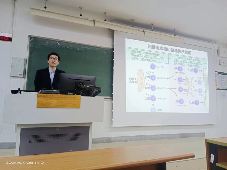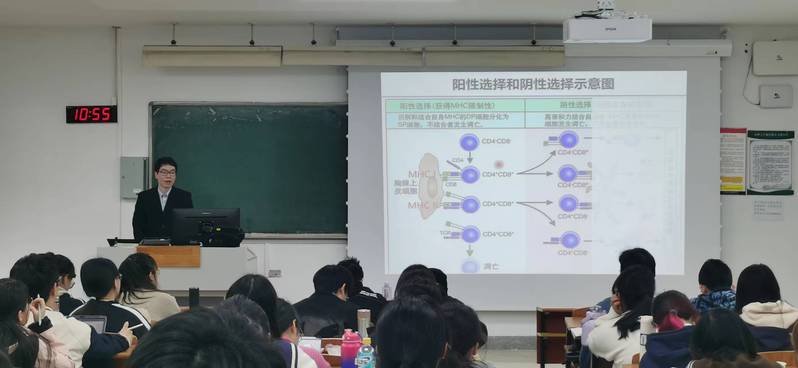 本次观摩课由我院特聘教授郑毅然呈现了一堂《微生物与免疫学》的高质量课程,郑教授讲授课程思路清晰,重点突出,教学内容紧跟学科前沿,做到了理论教学与实践教学的有机统一。郑教授巧妙地运用生活中的场景,生动形象地讲解了细胞分泌的三种形式。他比喻说,当我们心情低落或是考试紧张时,自分泌就如同自我鼓励,是内心深处的声音告诉自己可以战胜困难;而旁分泌则如同身边亲友的鼓励,他们的支持让我们更加坚定信心;内分泌则像是远方朋友的电话鼓励,虽然距离遥远,但那份关心与支持却能跨越千山万水,给予我们力量。此外,郑教授还将抗原递呈细胞召集适应性免疫细胞的过程巧妙地比作游戏中的“摇人”环节,这一比喻让原本抽象的概念变得生动有趣,同学们在笑声中轻松掌握了这一知识点。