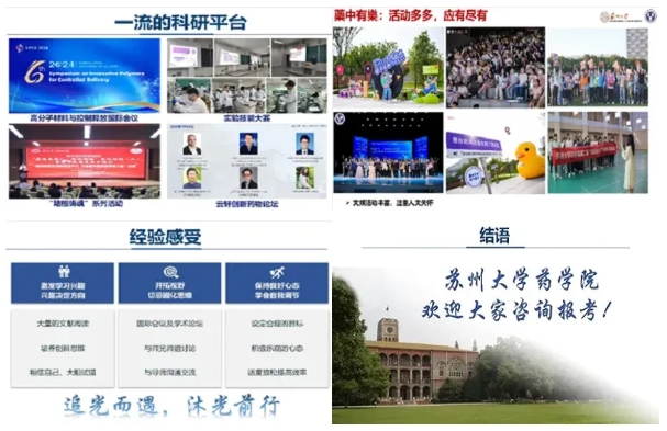 为期两天的夏令营活动内容丰富,涵盖了学科、专业学习、科研和未来发展的方方面面,感谢药学院老师、同学们的参与和付出,同时希望营员们对苏州大学苏州医学院药学院有更充分的了解,更加坚定攻读药学研究生的决心和信心。衷心祝愿同学们顺利获得推免资格或通过研究生升学考试,追光而遇,沐光前行!
