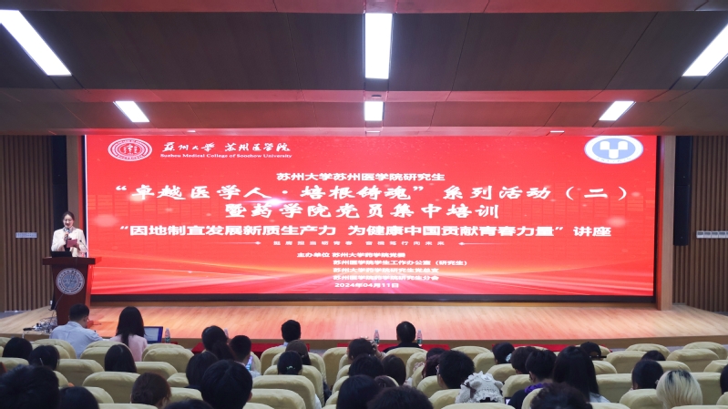 4月11日下午,苏州大学苏州医学院研究生“卓越医学人·培根铸魂”系列活动(二)暨药学院党员集中培训——"因地制宜发展新质生产力 为健康中国贡献青春力量"讲座在独墅湖校区医学楼4楼报告厅举办。药学院党委书记王欣,研究生辅导员李蕾、陆政廷、陆菲出席讲座。马克思主义学院习近平新时代中国特色社会主义思想概论教研室主任吉启卫教授担任主讲嘉宾。药学院240余位学生党员、入党积极分子现场聆听。