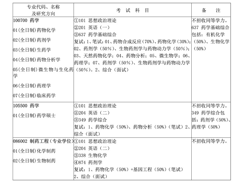药学专硕(105500)初试科目(349药学综合)从2022年的四门课程调整为:药剂学(50%)、药理学(50%)。复试科目调整为药物化学(50%)和药物分析(50%)。