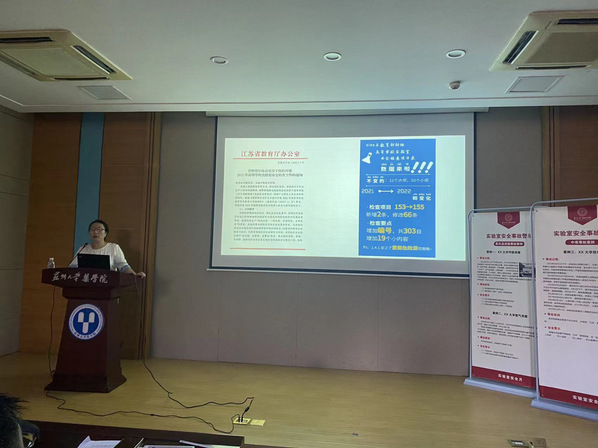 医学院安委会蒋芸老师为大家进行本次暑期实验室安全培训—暨省教育厅实验室安全检查迎检动员会,对高等学校实验室安全检查项目表(2022年)进行了详细解读,同时结合学院危险源特点、易出现的隐患等方面进行详细介绍及培训。