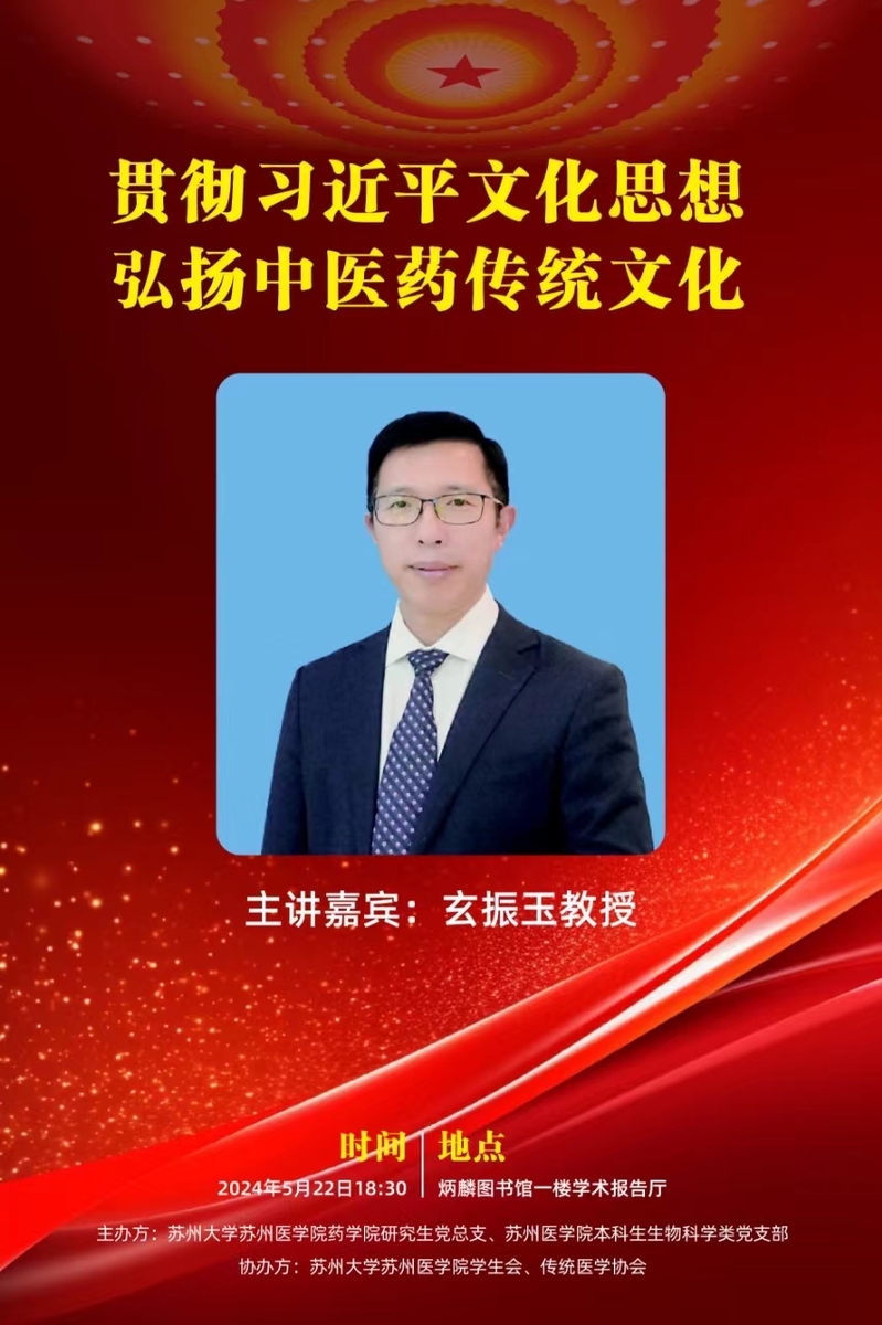 5月22日晚,“贯彻习近平文化思想,弘扬中医药传统文化”药学院研究生党总支和医学院本科生生物科学类党支部联合主题党日活动启动仪式在炳麟图书馆学术报告厅隆重举行。苏州医学院党工委副书记、副院长孟玲玲,药学院副院长黄小波,药学院中药系系主任、苏州中药所所长、玉森新药开发有限公司创始人玄振玉教授,药学院中药系副教授陆叶,研究生辅导员陆政廷、陆菲,本科生辅导员杨国兵、郝德深出席本次启动仪式。