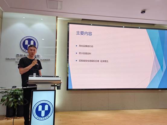安全培训后,学院专职安全员陈晶磊老师布置了本次实验室安全行动的具体内容,包括危化品(重点是剧毒化学品)摸底和防火自查自纠两项行动,并就近期实验室内安全隐患的整改情况进行了通报和介绍。