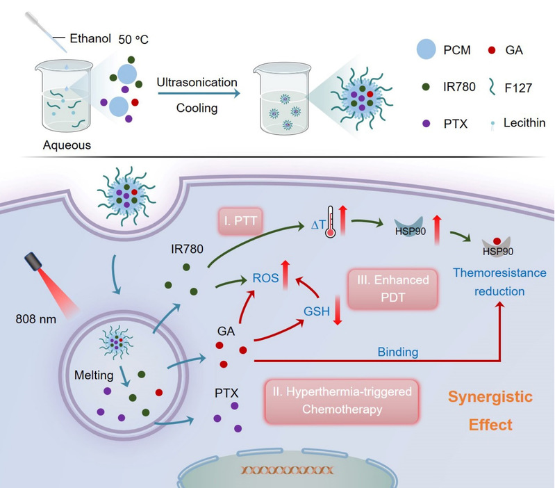 图1. 共负载PTX、IR780及GA的纳米药物制备及应用于肿瘤协同治疗的原理示意图