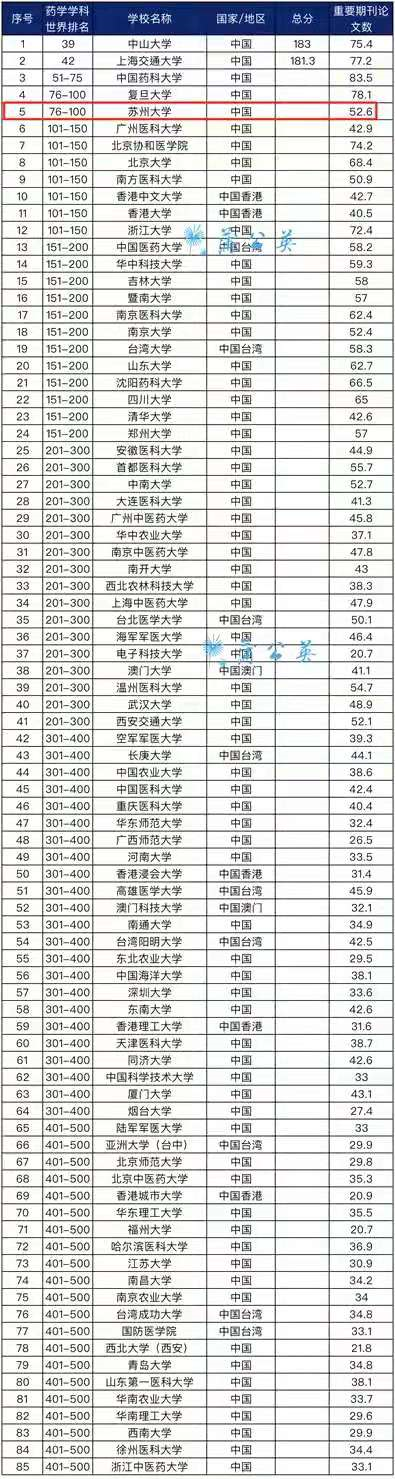 药学学科方面,本次世界排名共有500所学校,中国有85所学校上榜(而2020年,中国有73所学校上榜),其中中国大陆69所、中国台湾9所、中国香港5所、中国澳门2所。苏州大学位列全国第五,世界76-100位,世界排名与去年持平。