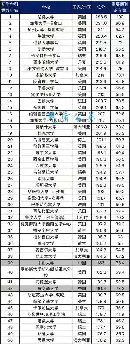 本次药学学科世界排名共有500所学校,前10名中,美国4所、英国3所、瑞典1所、丹麦1所、加拿大1所。前三名都被美国的大学包揽,分别是哈佛大学、加州大学-旧金山、加州大学-圣地亚哥。