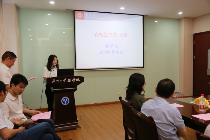 在校生代表张梦瑶(17级中药班),以及毕业生代表杭帆(博瑞制药总经理)做了现场发言并送上了纪念品,他们感谢了四位老师曾经给予自己的种种关爱和教诲,增强了前进的自信、照亮了前进的道路、指明了前进的方向。