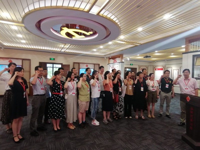 在刺绣博物馆的党史学习中心,党员们在学院党委王欣书记的带领下,面向党旗,再次重温入党誓词。宣誓时,每位党员声音洪亮,铿锵有力,传递出党员应有的自信和担当,展现出了理想信念的坚定和奋勇向前的勇气。