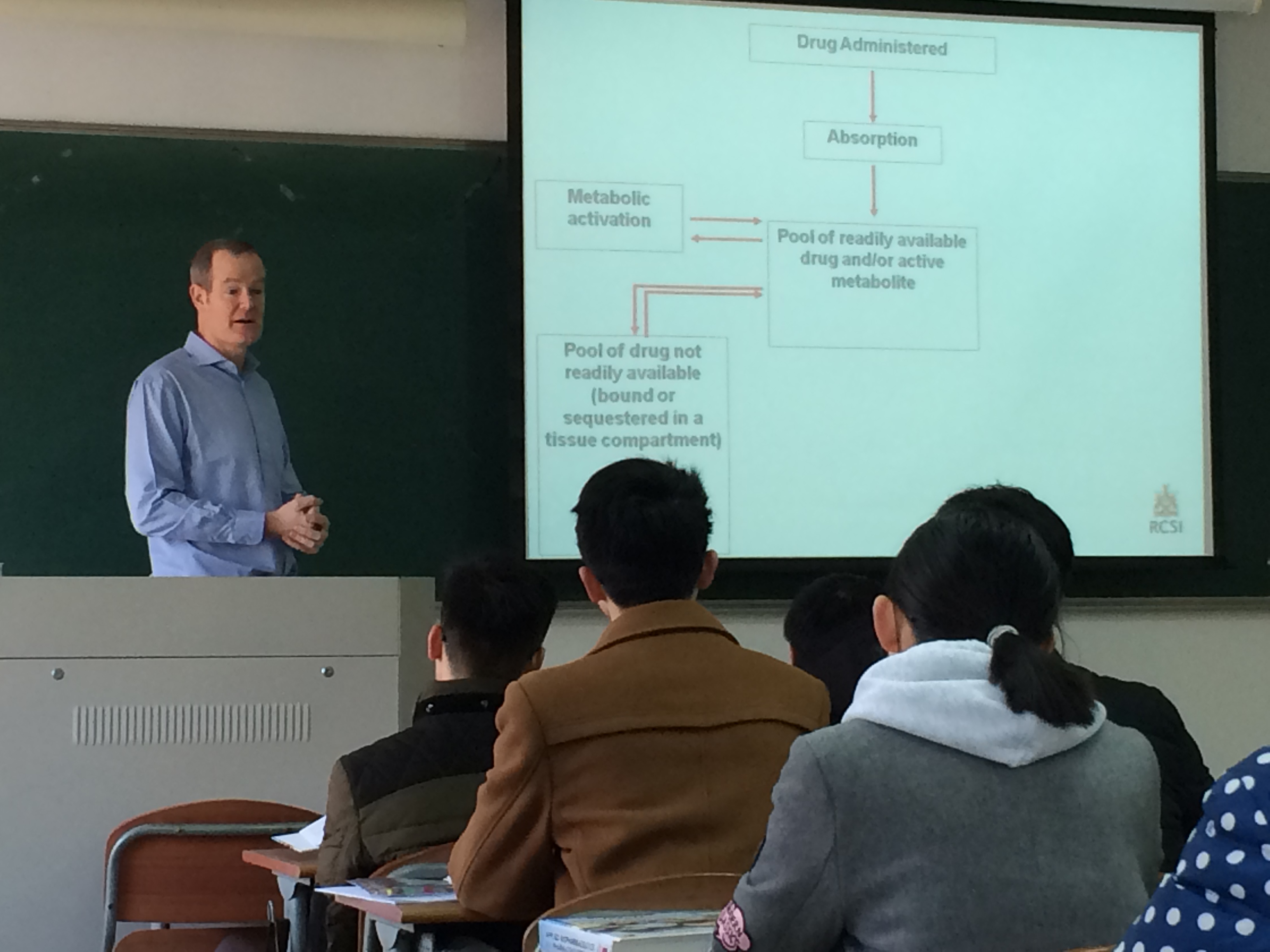 2017年2月28日-5月19日,在欧盟Erasmus+项目资助下,John L. Waddington、Brian Kirby、Shelagh Waddington、Darren Griffith和Samuel Maher等5位来自爱尔兰皇家外科医学院的教师为药学院药学专业本科生进行授课;5月17日,来自香港理工大学的Jian-Yong Wu副教授也为生物制药专业本科生进行了全英文授课。他们富有激情的授课,以及纯正的英文教学深深吸引了学生。学生们积极参与课堂讨论,提高了其英语学习的兴趣及英语交流的能力。