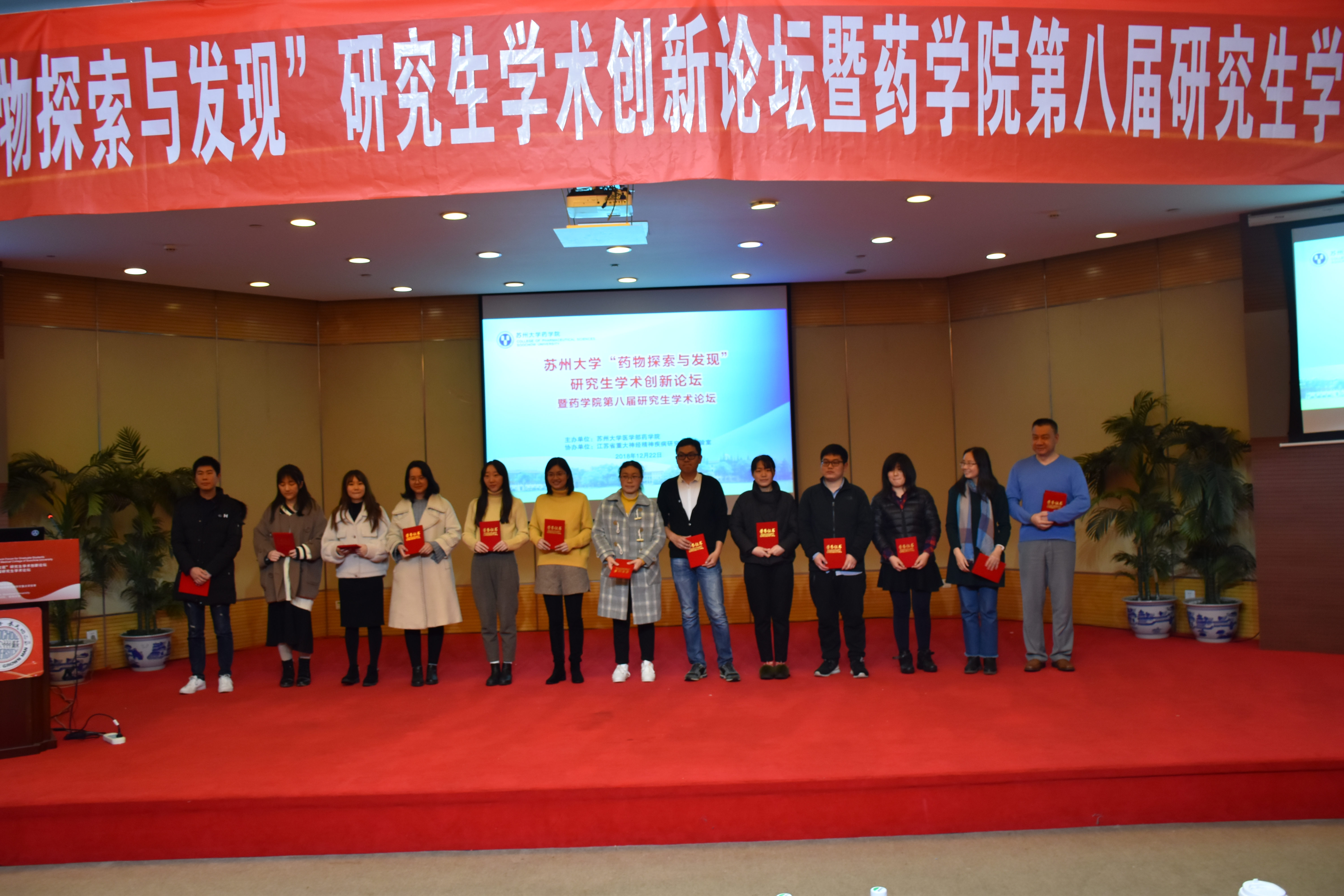 在两位院士精彩的汇报之后,药学院博士、硕士研究生相继向与会人员介绍了自己的研究领域和方向,并就研究项目相关的药学前沿知识向大家做了汇报。医学部主任秦樾教授、副主任苏雄教授以及药学院研究生导师对研究生学术报告进行了提问和点评。经评委会评选,最终评选出药学院学术论坛奖学金学术报告奖一、二、三等奖和优胜奖,以及学术墙报奖优秀奖和优胜奖。最后,药学院教授委员会主任、药理学系王光辉教授做了精彩的总结点评,学院领导和教授代表向获奖研究生颁发了荣誉证书。至此,苏州大学“药物探索与发现”研究生学术创新论坛暨药学院第八届研究生学术论坛圆满落幕。
