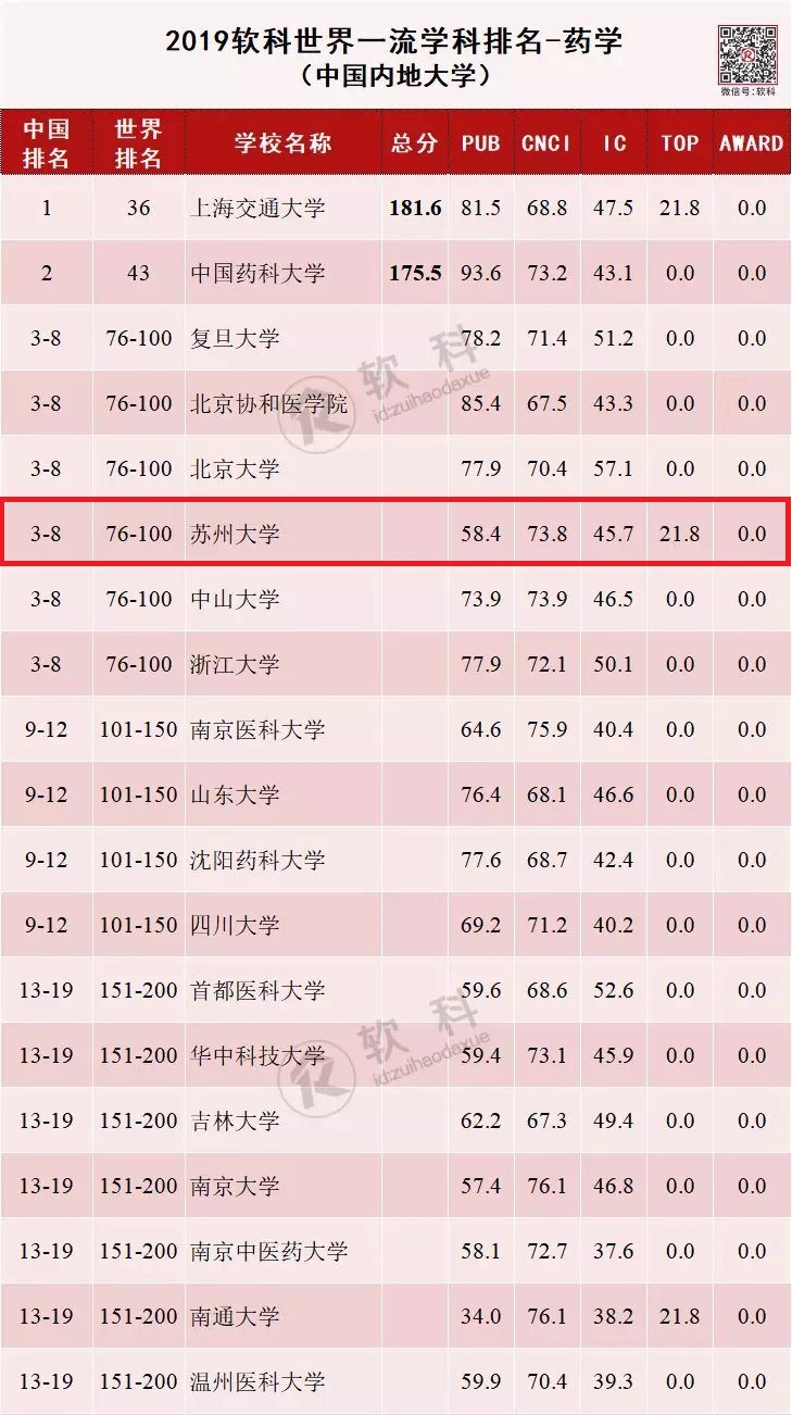 软科昨日(6月26日)正式发布2019“软科世界一流学科排名”(ShanghaiRanking's Global Ranking of Academic Subjects)。2019年排名覆盖54个学科,涉及理学、工学、生命科学、医学和社会科学五大领域。可喜的是,苏州大学“药学”学科进入世界排名前100名,中国内地排名3-8位。
